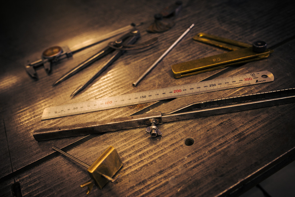 righelli, calibri, false squadre, compassi o i più inusuali “truschini” autocostruiti… tutti strumenti utili per avvicinarsi alla perfetta realizzazione dei pezzi battuti a mano.